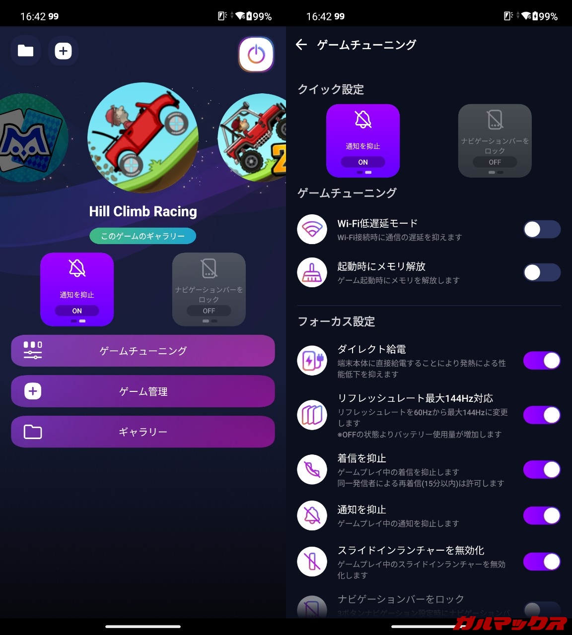 ▼あとゲームモードも対応しておりUIデザインもなかなか出来上がってます。安い中華スマホと違って最低限ではなく機能性もあり、着信・通知ブロック、ダイレクト充電、Wi-Fi低遅延といった要素も備えてある‥ナビバーロック機能があるのもありがたいです。↓