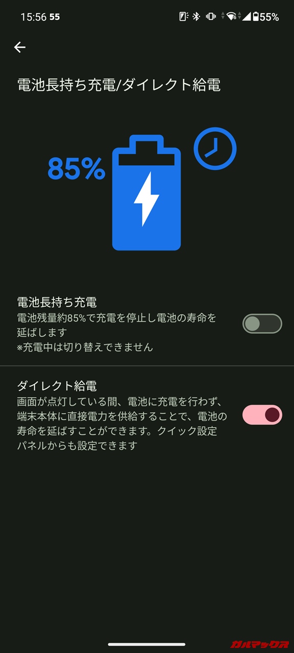 長時間ゲームする場合、バッテリー残量を減らしたくないけど、満充電しっぱなしだとバッテリー性能が低下、ひいては最大残量の低下やバッテリーの膨らみといった懸念点もあるので、この機能はマジでありがたい。長時間動画を流し見するにもバッチリです。