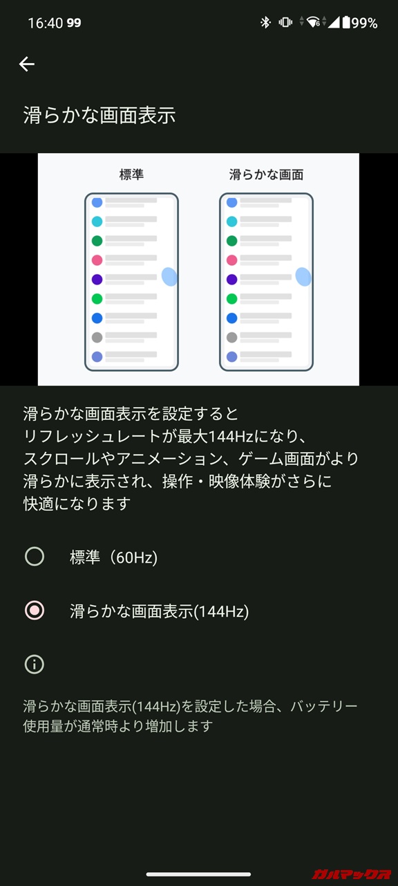 ▼注意点として、リフレッシュレートは144Hzか60Hzの2つしか選べません。中間である90Hzの設定も欲しかったところ。あれ滑らかさと電池持ちを両立出来てて個人的に一番バランスいい設定だと思うんだよなぁ。対応してほしかったわ。↓