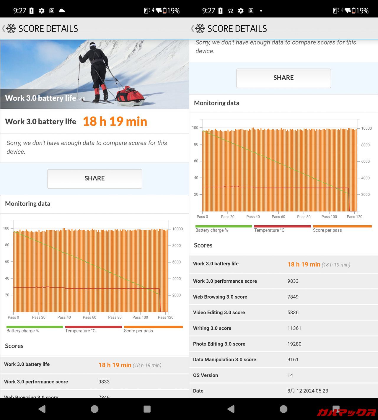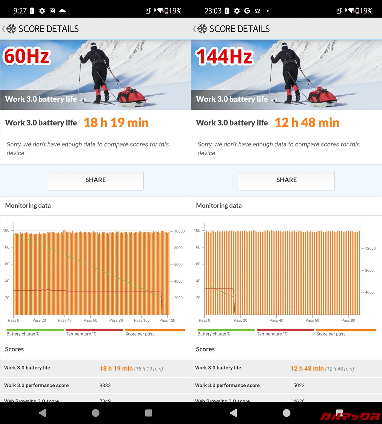 ▼バッテリー持ちの検証では60Hzが18時間19分(ベンチマーク部分に貼付け済み)で、144Hz表示モードでは12時間48分!↓