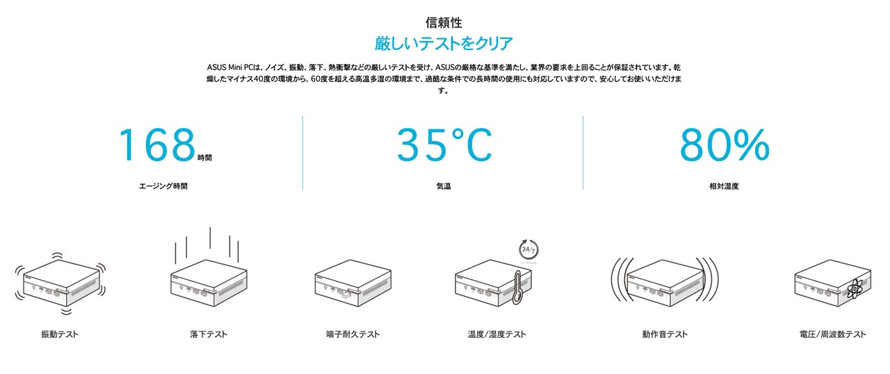▼ASUS Mini PCシリーズ全体の特徴ではありますが、振動や落下、端子耐久テストや-40℃〜60℃での環境下での温度テストなど厳しい基準をパスして生まれる高い耐久性も魅力の一つ。過酷な環境下での業務用PCとしても安心ですね!↓