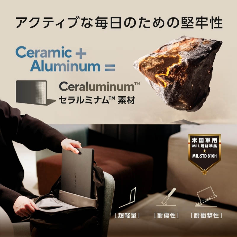 ▼本体重量は899g、980gと軽い!本機はセラミックとアルミニウムを融合させたセラルミナム素材を使用。ASUSの独自素材で、米国の軍用規格であるMIL規格にも準拠できるレベルの薄くて頑丈なボディを実現しているそう。↓