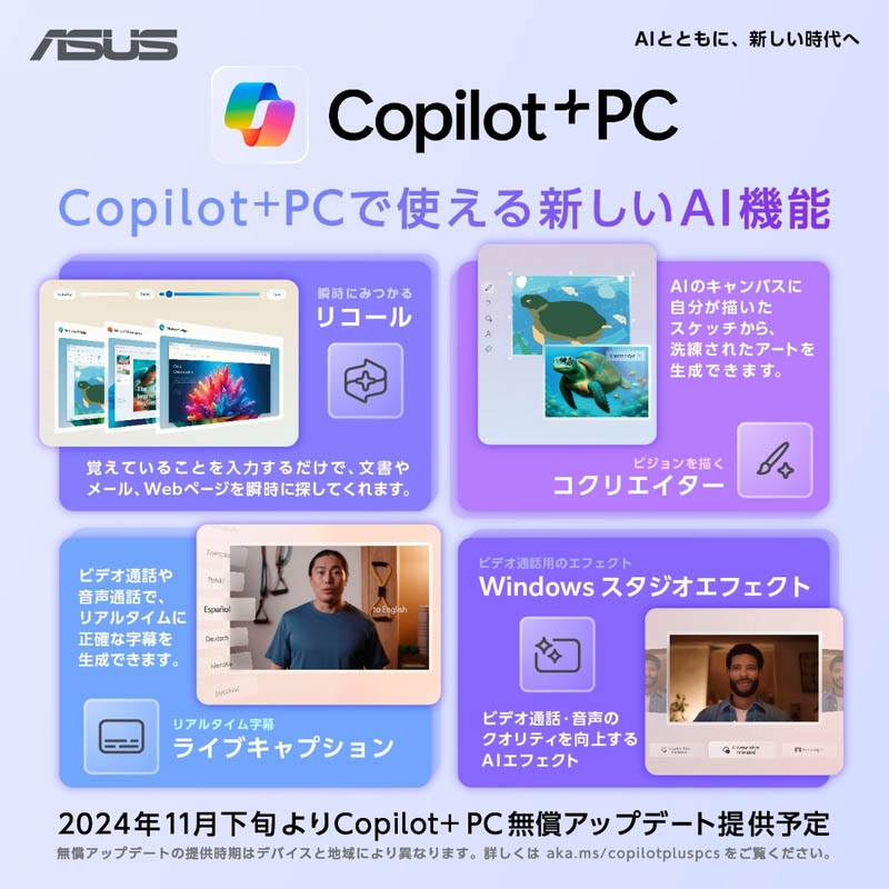 ▼過去の動作を呼び起こせるリコール、文章や画像を生成する、リアルタイム字幕、自然言語でのファイル搜索などのCopilotのAI機能を搭載。リアルタイム字幕は便利だけど、それ以外は果たしてどれぐらい使うんでしょうか…↓