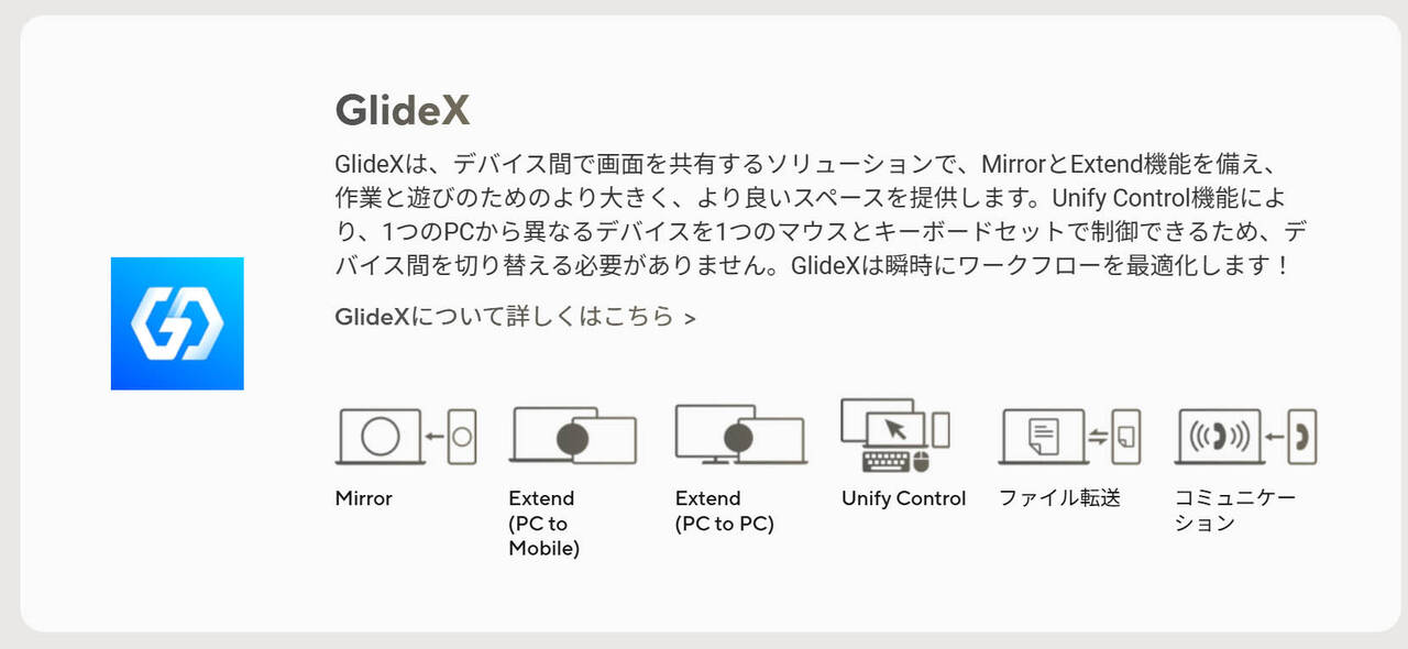 ▼独自ソフト「GlideX」を利用することで画面の拡張、ミラーリング、ファイル転送などを簡単に行うことができます。↓