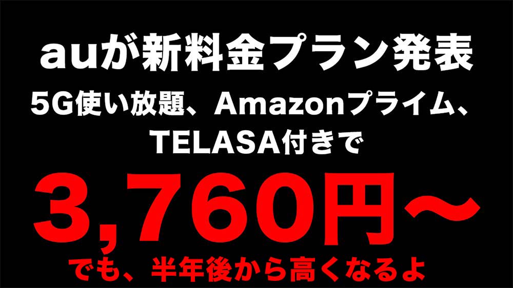 ドコモが新料金プランahamoの発表をしましたが、それに刺激を受けたのかauも新料金プラン「データMAX 5G with Amazonプライム」を発表しました。データ使い放題、Amazonプライム利用権付きで月額3,760円〜。