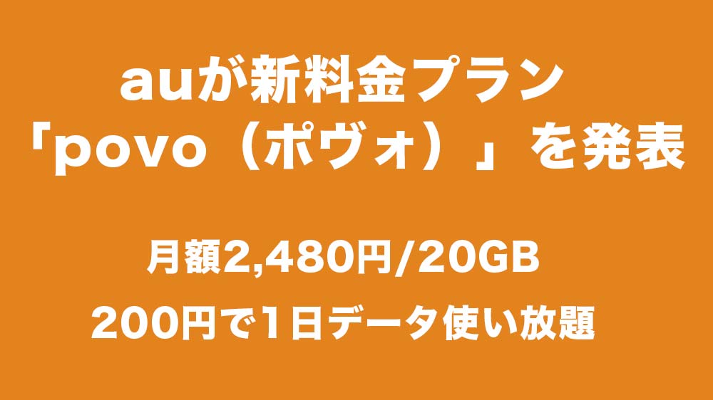 auがドコモやソフトバンクの低価格プランに対抗した新料金プラン「povo(ポヴォ)」を発表しました。利用料金は日経が報道していた通り月額2,480円(税別)で確定です。