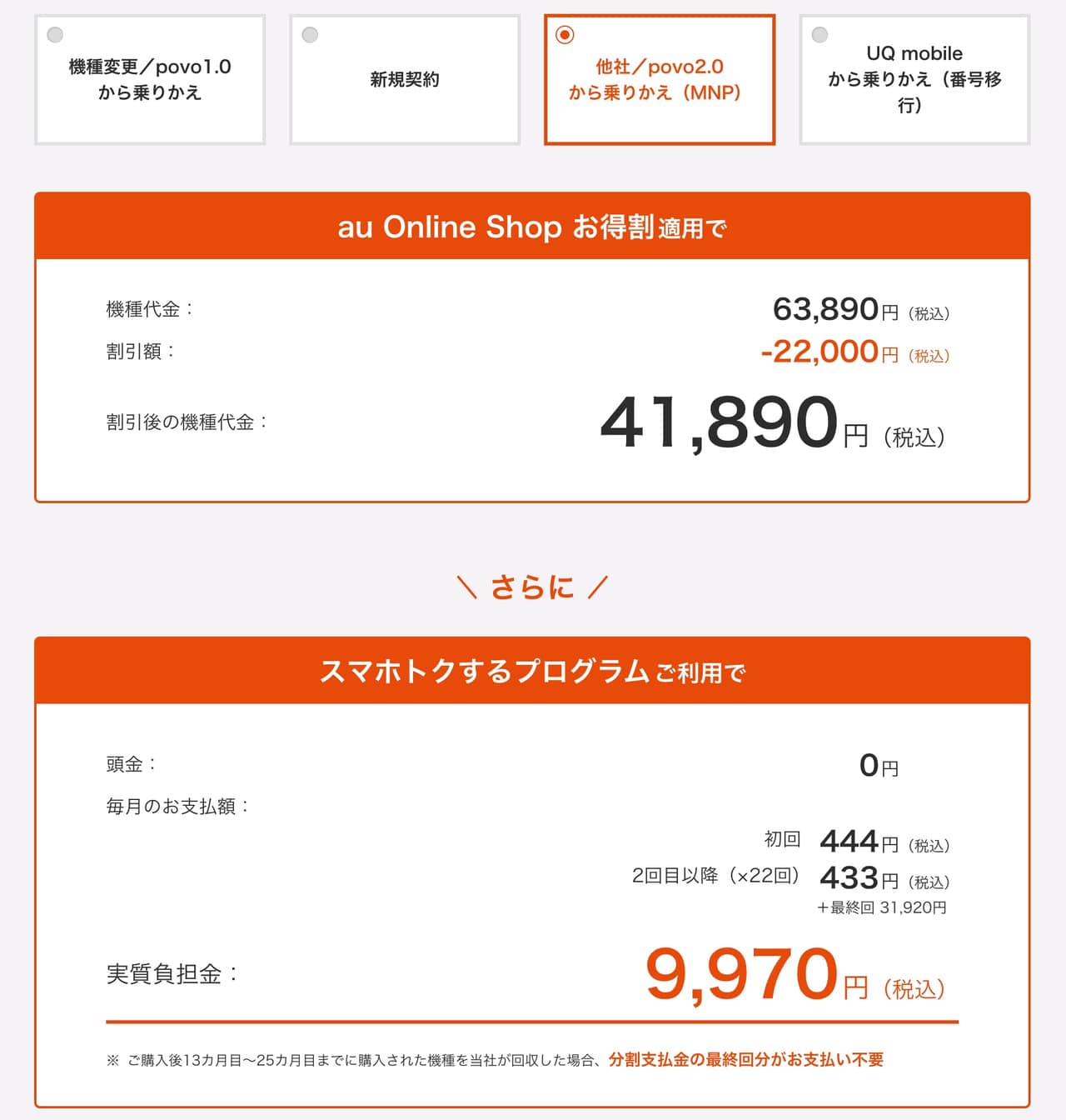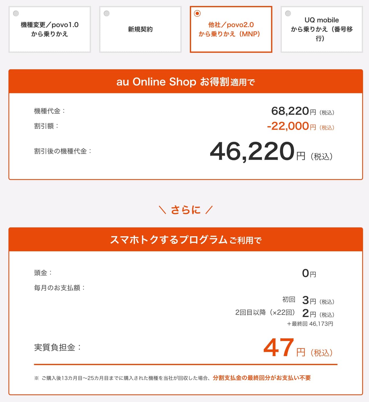 ちなみにこの値段でレンタルするには上記画像の通り、au Online Shop経由じゃないと22,000円割引が受けられないので、申し込みはau Online Shopからってのを忘れるんじゃないぞ。