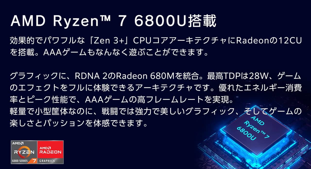 ▼プロセッサにはAMD Ryzen 7 6800Uを搭載!なお同社モデルでもAYANEO 2やAYANEO GEEKがこれを搭載しています。↓