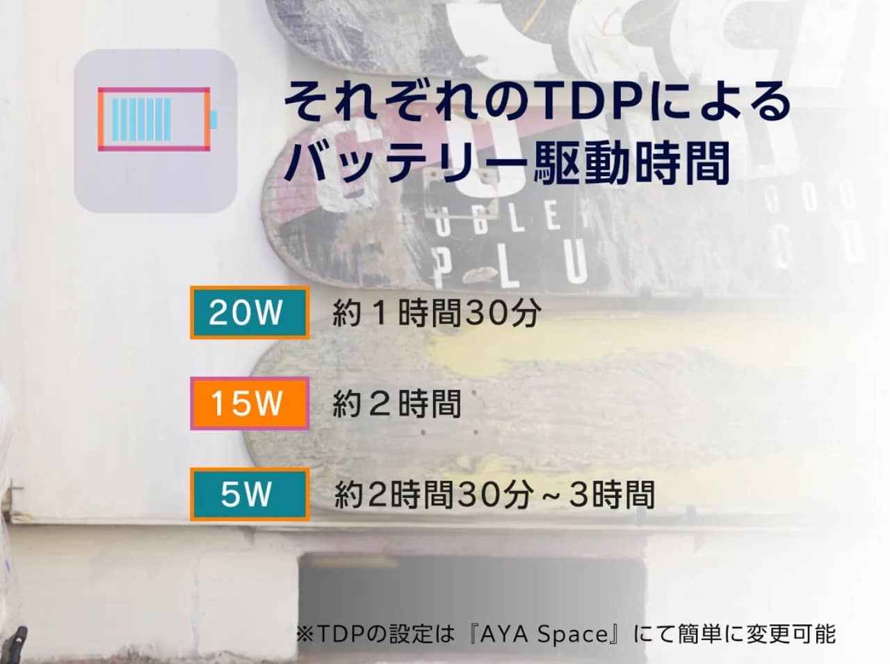 ▼バッテリー持ちは消費電力ごとに異なり、低電力の5Wでは最長3時間ほどもつとのこと。20Wの場合は1時間30分だそうです。↓