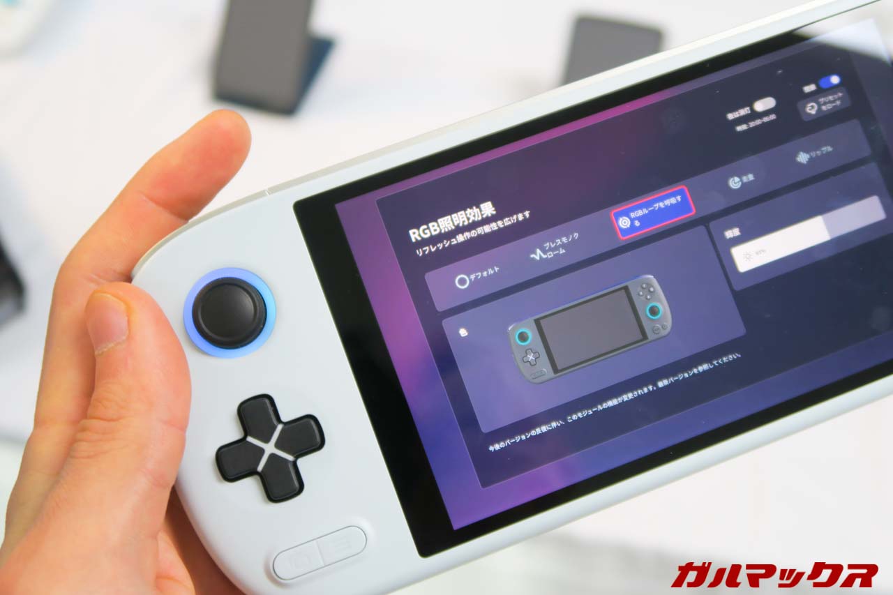 ▼色合いはオシャレだけどスティック周辺はLEDライトがバッチリ内蔵!一見おとなしめな見た目だけど、隠しきれないゲーミング感というアクセントが効いていますな。↓