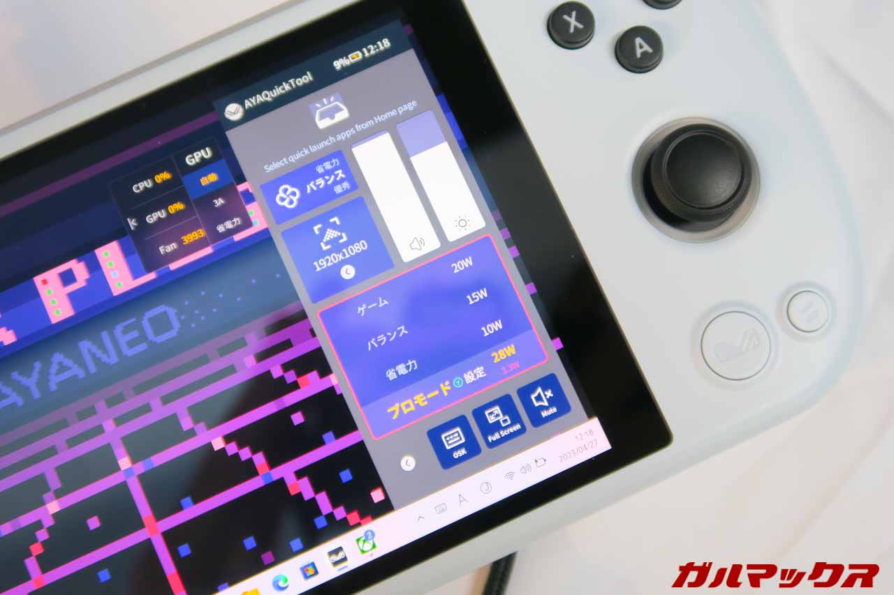 ▼クイックツールも搭載。ゲーム中でも開きやすいのが良いですね。消費電力モードの切り替えや音量、輝度調節などもサクっと操作できます。↓