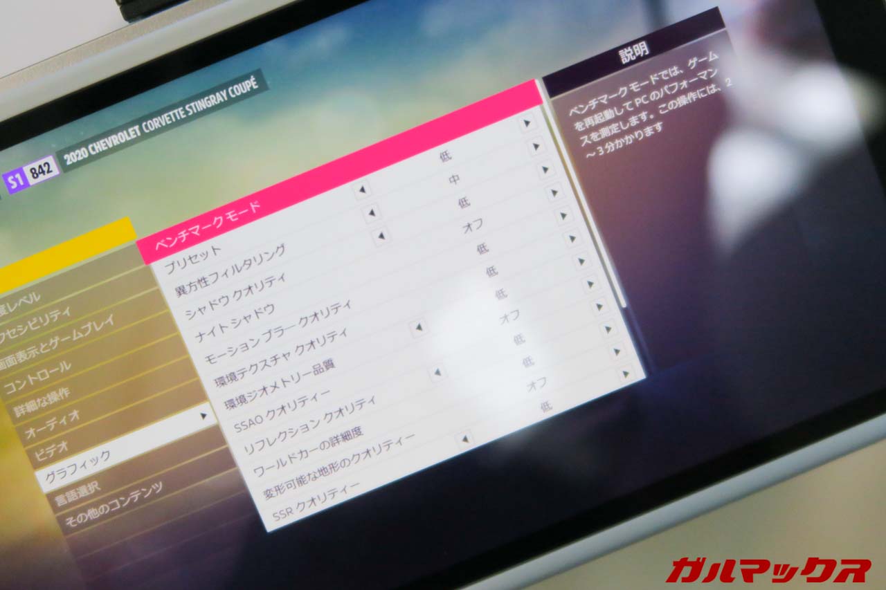 ▼なおHorizon 5のグラフィック設定はプリセットが「低」設定。グラフィック粗いんかなと思ってたんだけど、全然そんなことなかったっす。そもそも画面が小さいから気づきにくいし全然キレイで気にならんレベルでした。↓