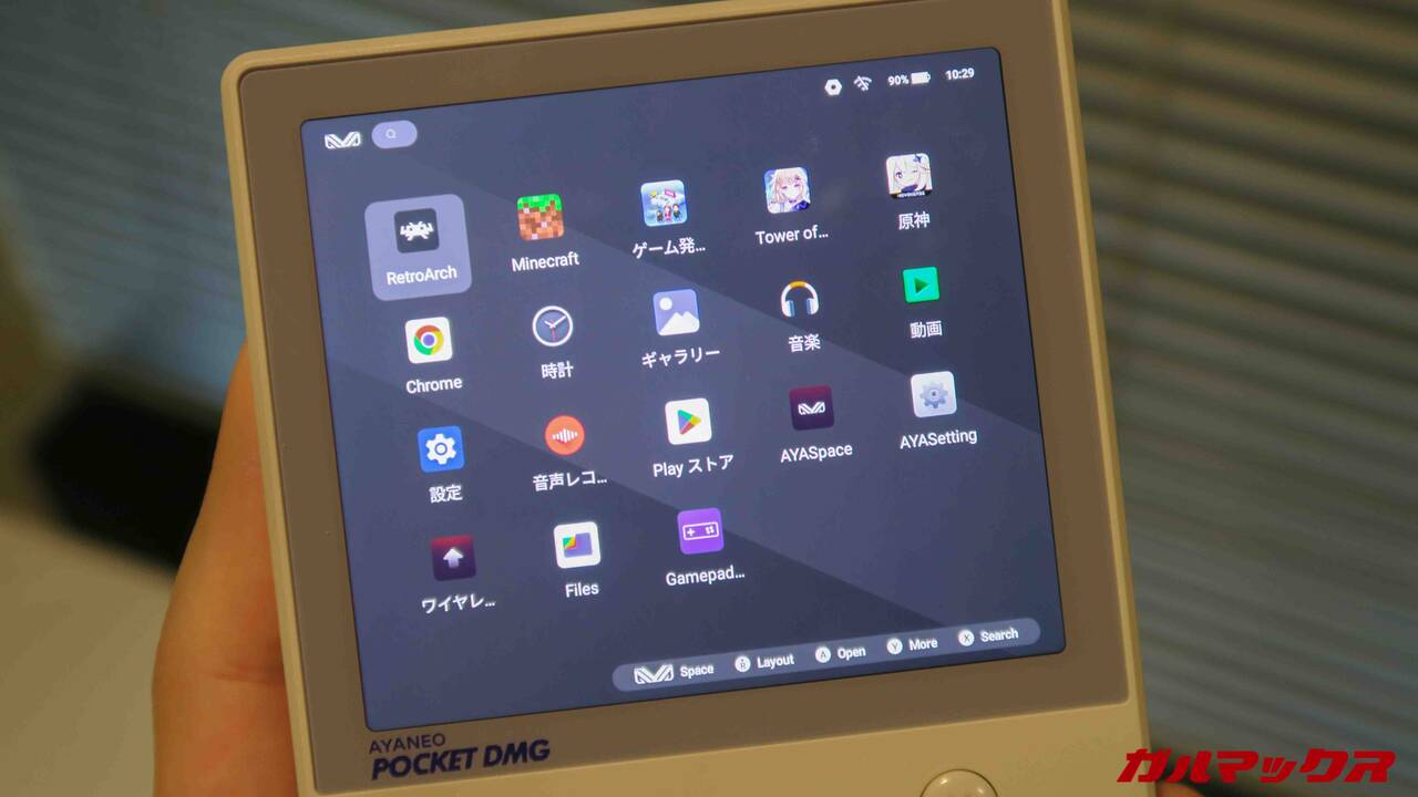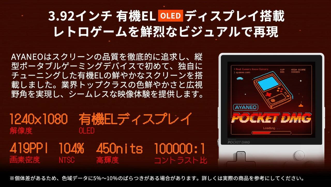 ▼AYANEO POCKET DMGのディスプレイ、なんと有機ELなんですよ。見た目レトロなのに有機EL搭載っていい意味でイカれてます。アス比はほぼ真四角ながら解像度もFHDクラス以上を確保しているのもGood!419dpiと高精細でドットの粗さなぞ感じません。↓