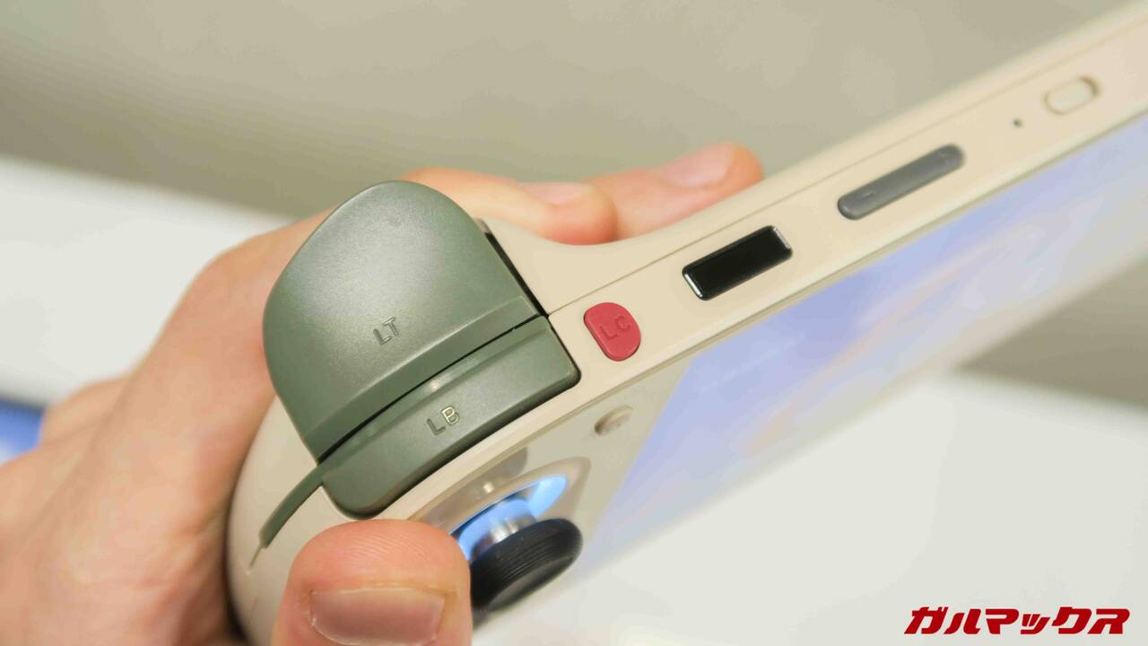 ▼AYANEO POCKET DMGと異なりしっかり押し加減が調節できるタイプのトリガーとなっています。黒いのは指紋認証センサー。↓