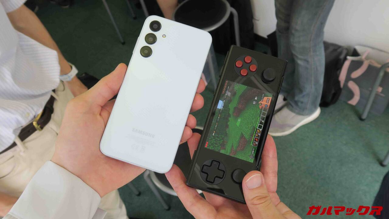 ▼平均的サイズであるAndroidスマホのGalaxy A25くんを持ってきました。並べたらこんな感じ!サイズがほぼ一緒でした。厚みはスマホ約2台分で重さは233gと結構ありますが、ハンドヘルド機としてはとんでもなくコンパクト。↓