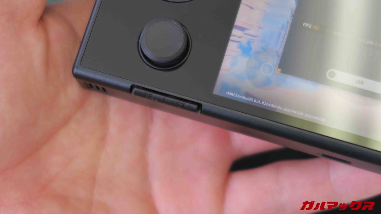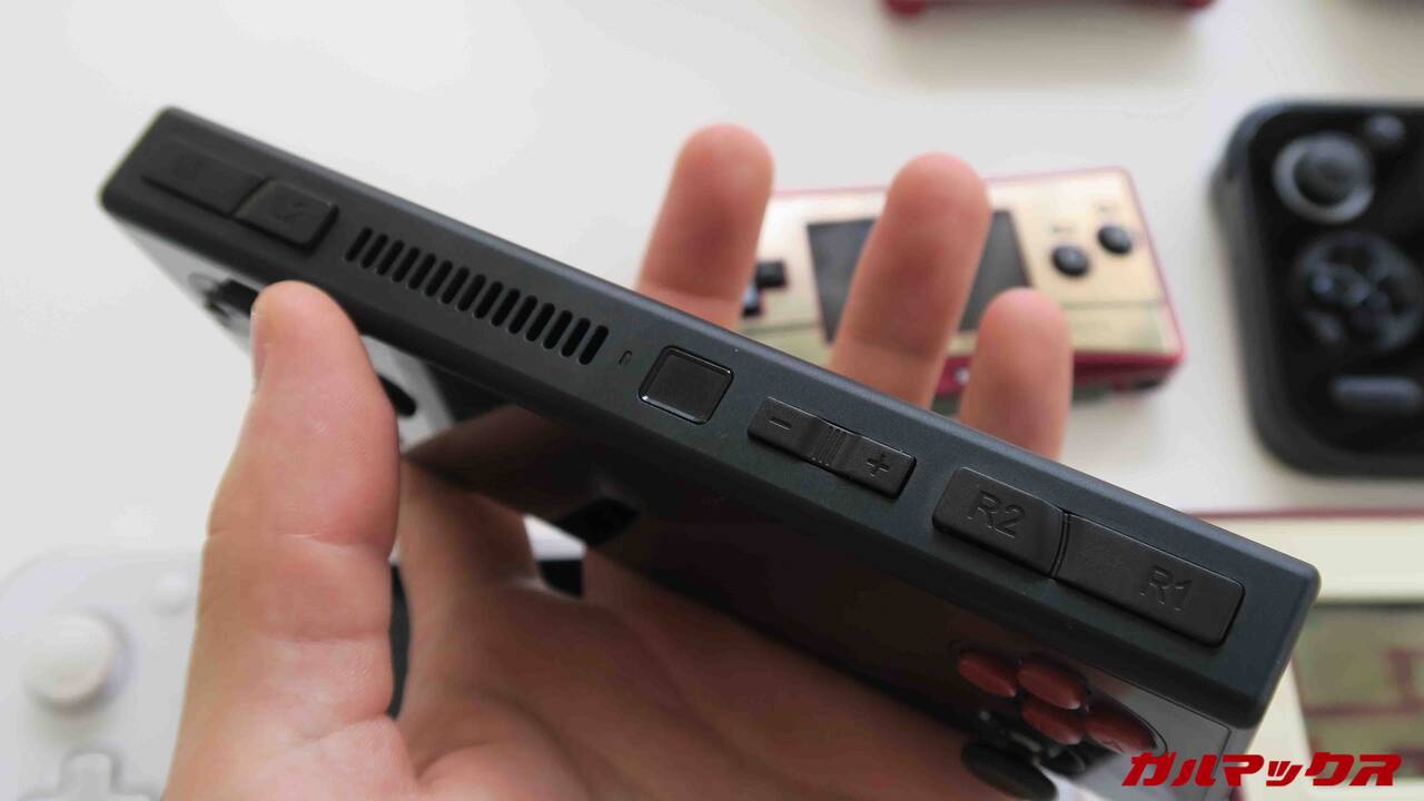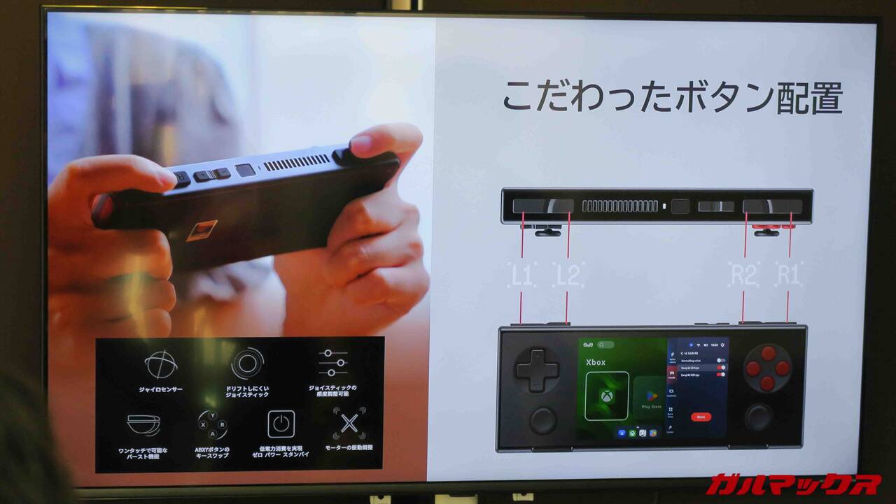 ▼下部にはスタート・セレクトにあたる小型ボタンが埋め込まれていました。高さもあって押しやすい!ちなみにAYANEOのCEOであるアーサー氏が一番こだわった部分らしい。↓