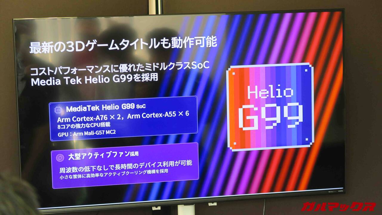 ▼気になるSoC、なんとMediaTek Helio G99でした。こちらはRedmi Padなど様々なデバイスで採用されている、コスパのいいことで知られるミドルレンジ6nmチップでございます。↓