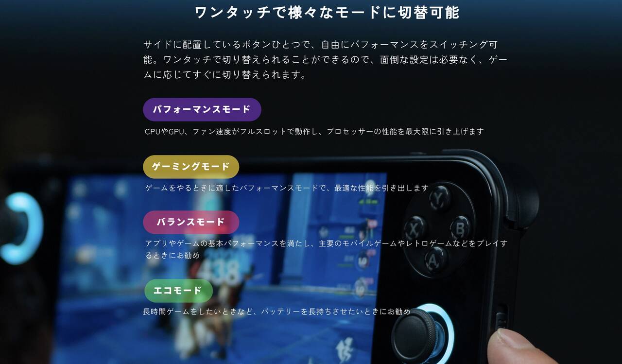 何でもハイパフォーマンスモードで良いじゃん、って思いそうですが、性能を最大まで発揮すると電池も食います。なので不必要なオーバーパワーはセーブしたほうが長時間ゲームを遊べますよ。