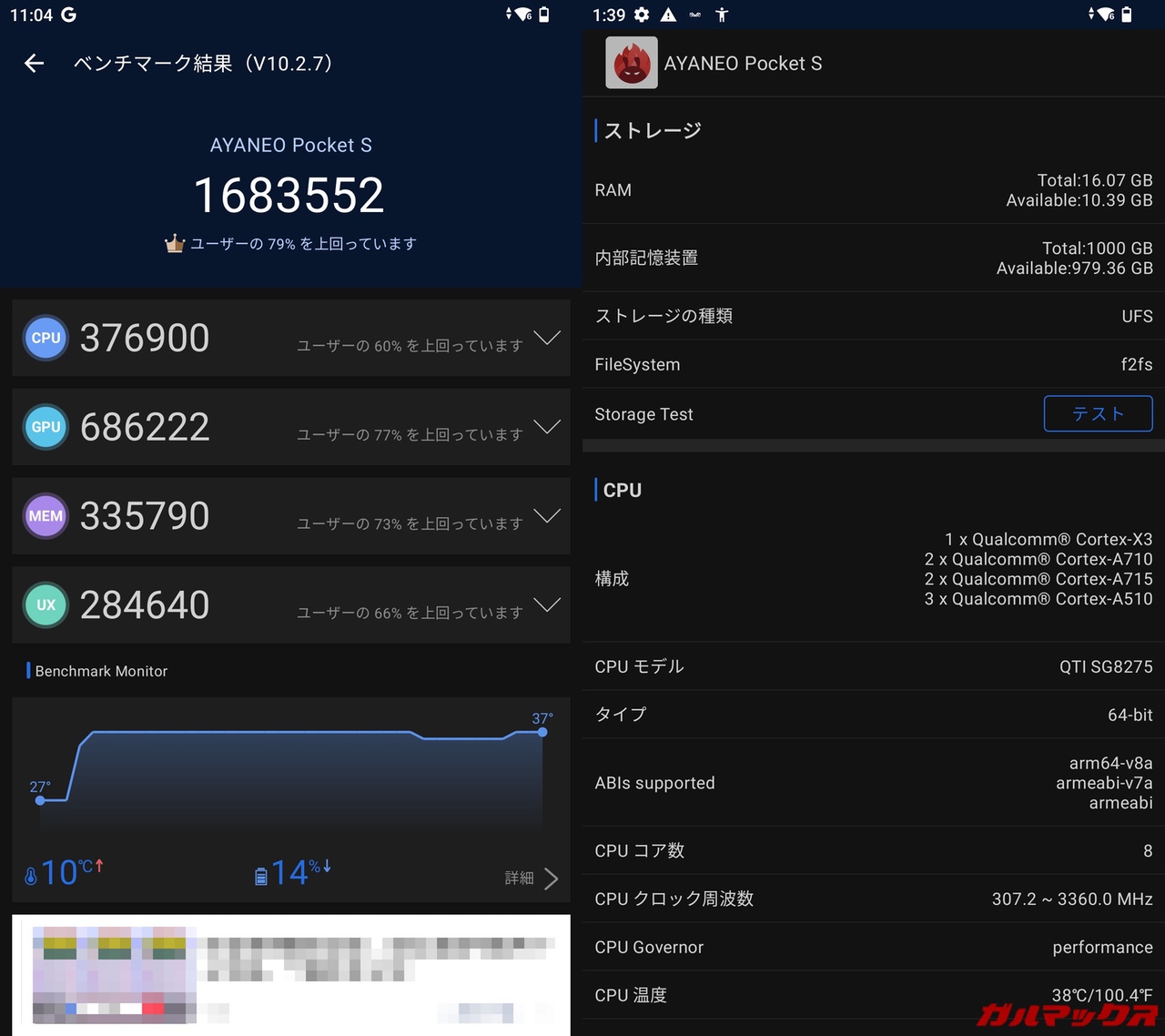 AYANEO Pocket Sが搭載するSoCはゲーム向けSoCの「Snapdragon G3x Gen 2」を搭載。AnTuTuスコア的にはSnapdragon 8 Gen 2のGPU強化版って感じです。