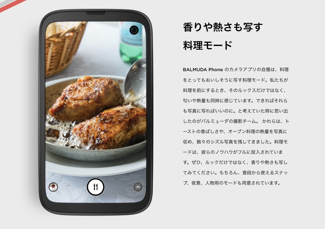 ▼カメラはシングルカメラですが料理、人物、夜景、ムービーモードに対応。特に料理撮影ではバルミューダの撮影チームのノウハウが詰め込まれているそうで、「美味しそうな映える写真」を撮影しやすそうです。↓