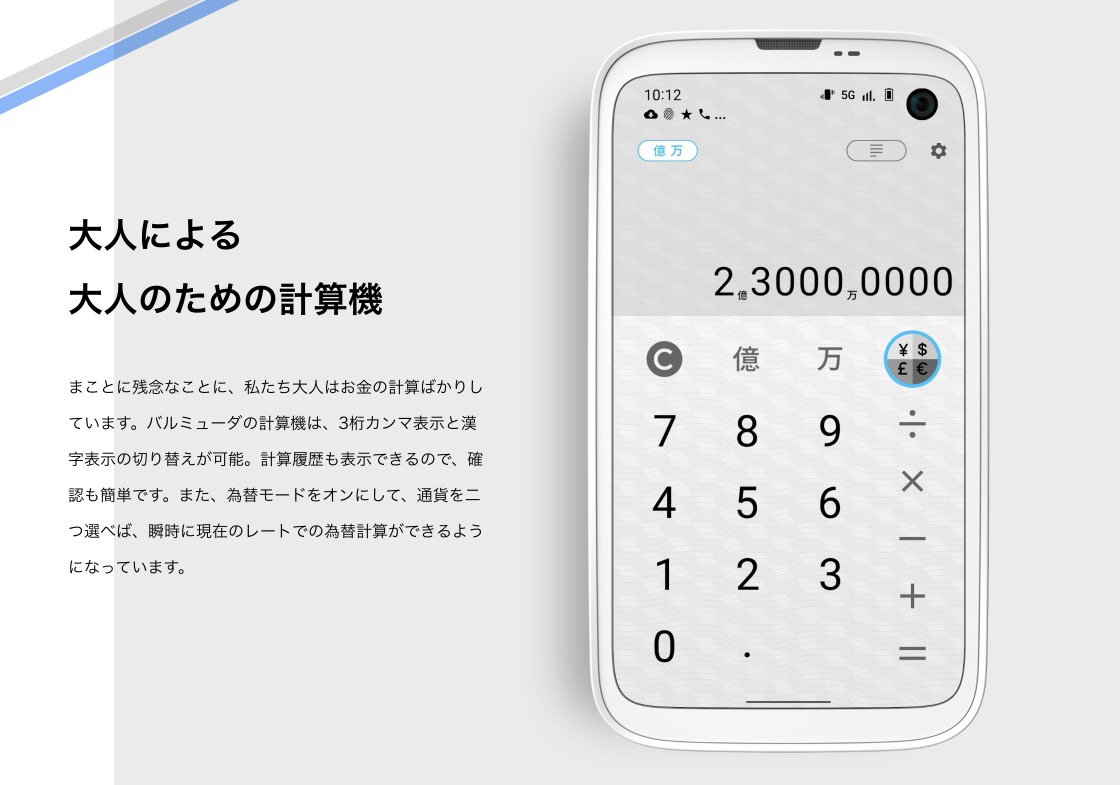 ▼自社製アプリも細部に拘っているようで、計算機では3桁カンマ表示以外に億や万といった漢字表示もできるように。これはパッと見ただけで分かりやすくてGoodですね。他にもスケジュール、メモなどビジネスシーンでも使いやすそうなアプリが詰め込まれてます。↓