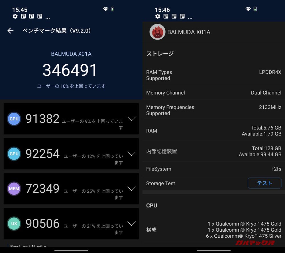 バルミューダフォン/メモリ6GB(Snapdragon 765)の実機AnTuTuベンチマークを掲載しています。