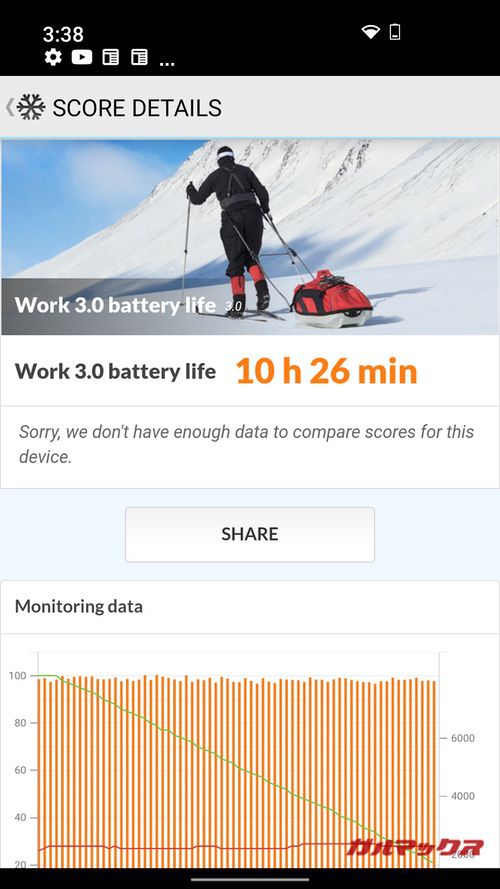 ▼バッテリー容量は2,500mAhとイマドキのスマホとしては非常に小さく電池持ちは悪い部類。Battery life測定では10時間26分ですが、レビューで実際使用したところだと7時間ほどの電池持ちでした。↓