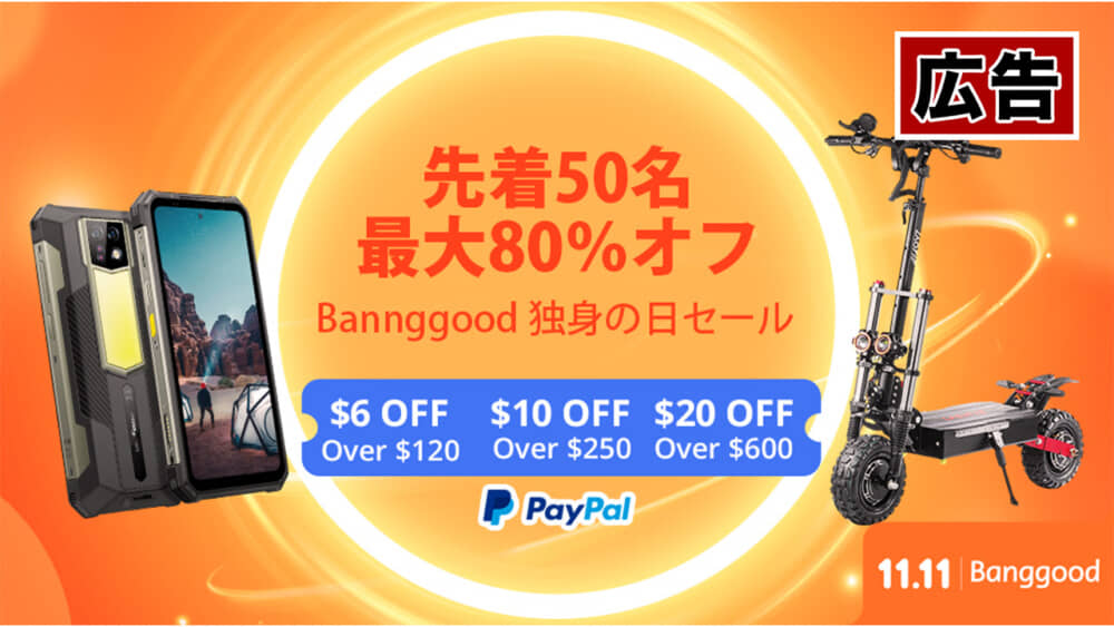 Banggood独身の日セール2023開始!PayPal支払がオススメ!11月14日まで!