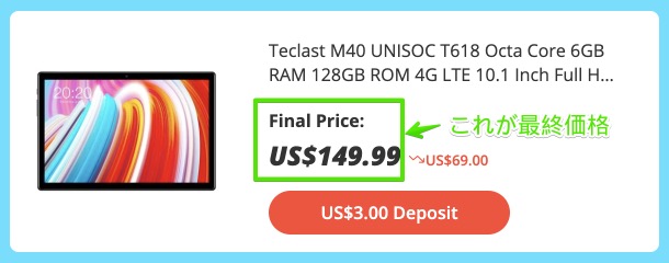 デポジット商品は手付け金を先に支払っておくと割引価格で購入できる製品。ちょっと表示が分かりづらかったんで補足しておきます!