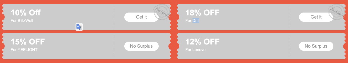 割引クーポン会場ではブランド指定の割引クーポンを配布。記事執筆時点ではBlitzWolf(10%オフ)とDrillpro(18%オフ)の割引クーポンが発行されていました!
