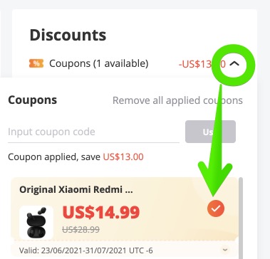 また、クーポン会場では様々な製品がクーポンを適用することで割引価格にて購入可能となってます!例えばXiaomiのイヤホンは通常価格27.99ドルですが、割引クーポンを適用することで14.99ドルに!