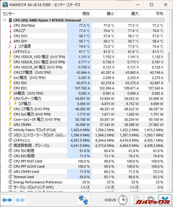 Beelink SER8が搭載するRyzen 7 8745HSはモバイル向けRyzenの中でも消費電力も多めなハイスペック寄りのモデルですが、そこで気になるのは発熱関係。ということで実際にチェックしてみました。