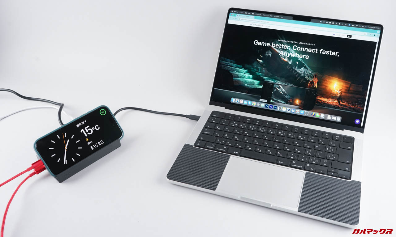 ノートPCのドックとして使う場合、フリップスタンドはスマホのスタンド+充電用としても使えます。