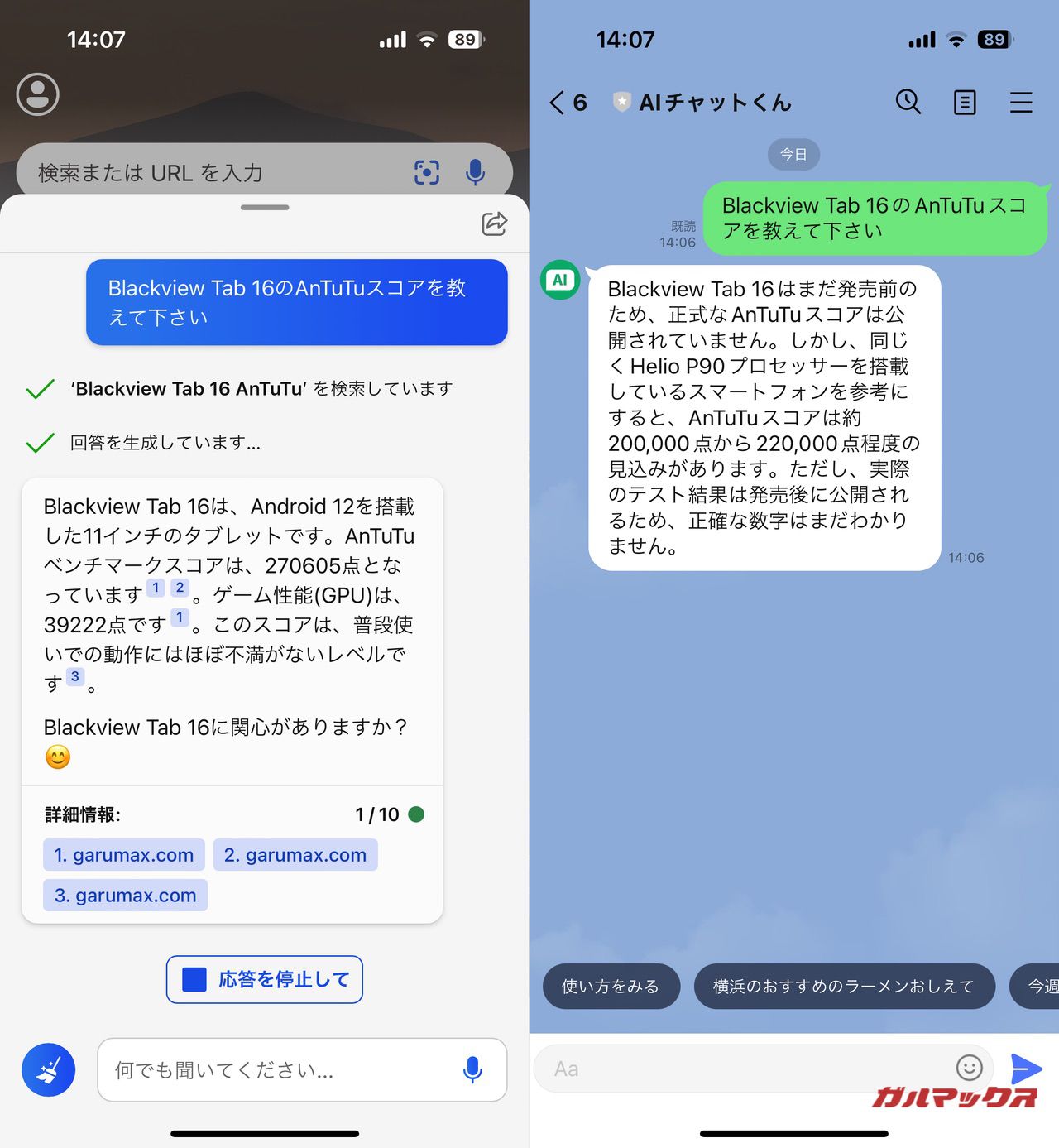 今回は発売したばかりのBlackview TAB 16のAnTuTuスコアを知りたいと質問したんですが、ガルマックスはレビューで取得した実機のAnTuTuスコアを掲載していて、それをBingのAIチャットは情報の引用元として引っ張っていることが分かります。