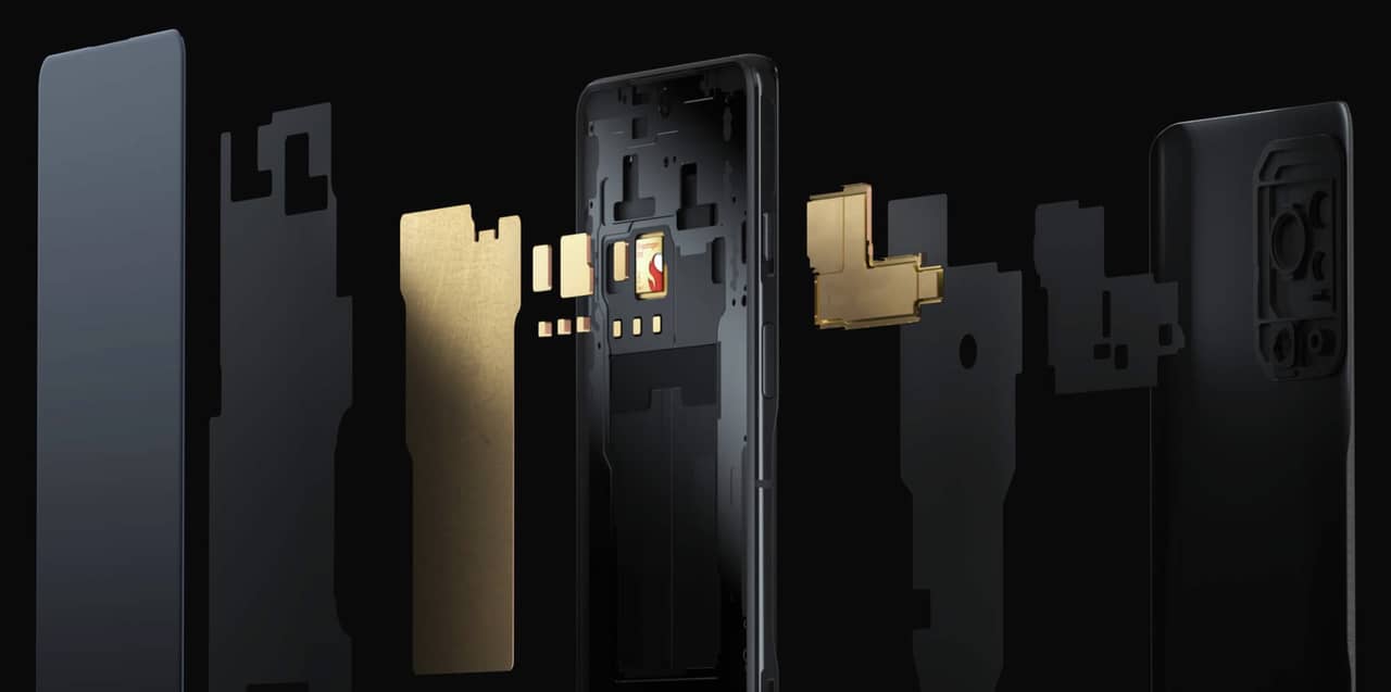 Snapdragon 8 Gen 1は発熱がヤバい曰く付きのSoC。その点をどうやってクリアするのかが見ものなんですが、Black Shark 5 Proはサンドイッチ型で驚異的な総面積5320mm²を誇るデュアル液冷システムを搭載。