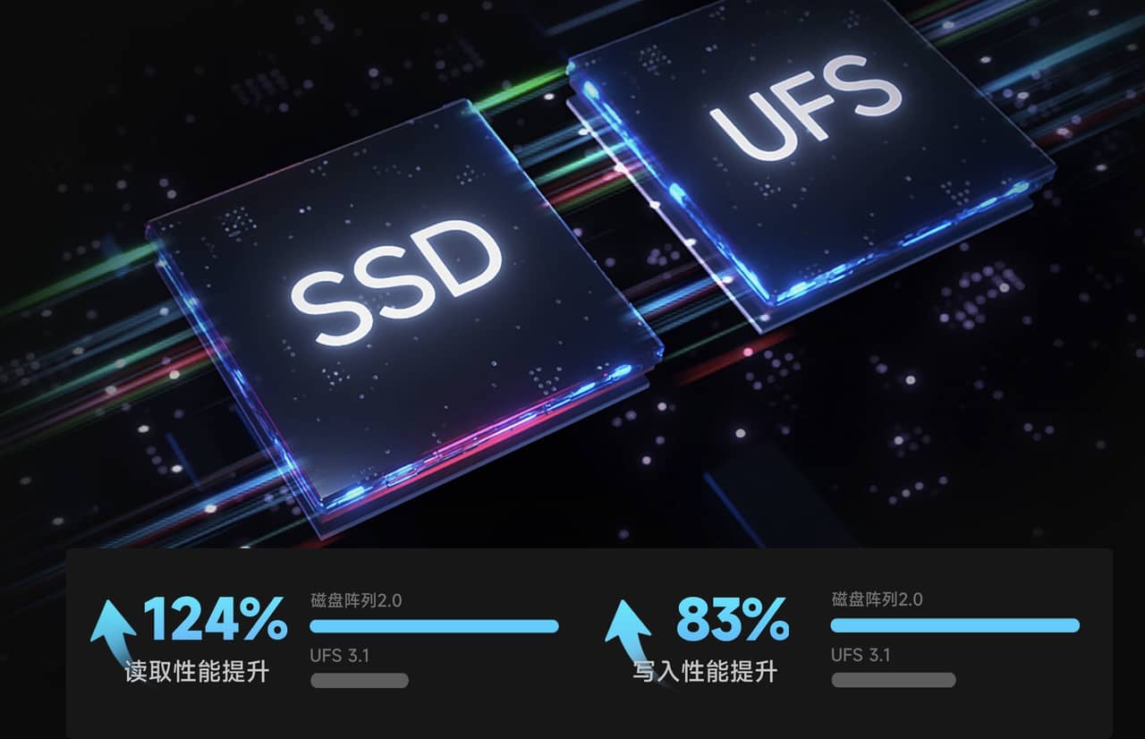▼ストレージはRSと同じくNVMe SSDとUFS3.1を組み合わせたRAIDシステムを搭載することで読み書き速度が格段にアップ。ロードの待ち時間も短縮できそう。↓