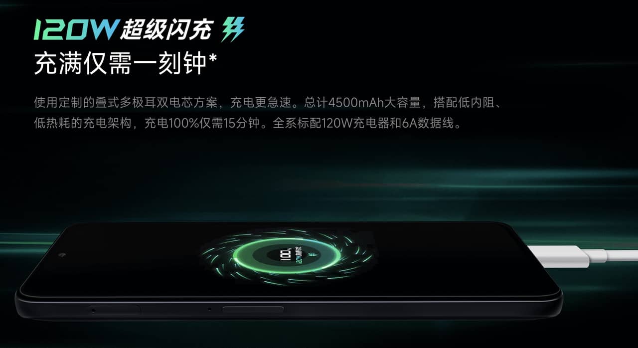 ▼バッテリー容量は4500mAhでトップクラスの120W充電に対応。15分で100%充電できるのでゲームの空き時間にパパっと充電できるようになってます。↓