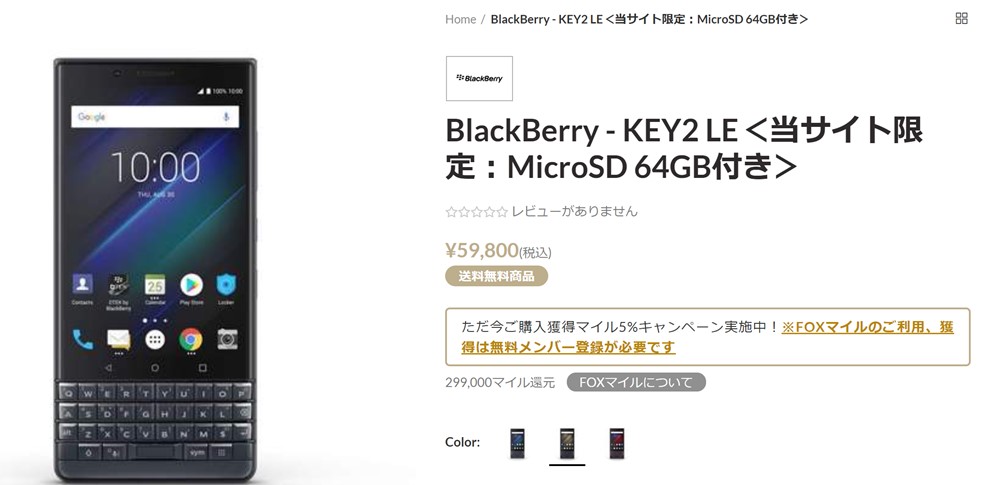 価格(予定) BlackBerry(R)KEY2 LE:販売価格:55,370円(税別)