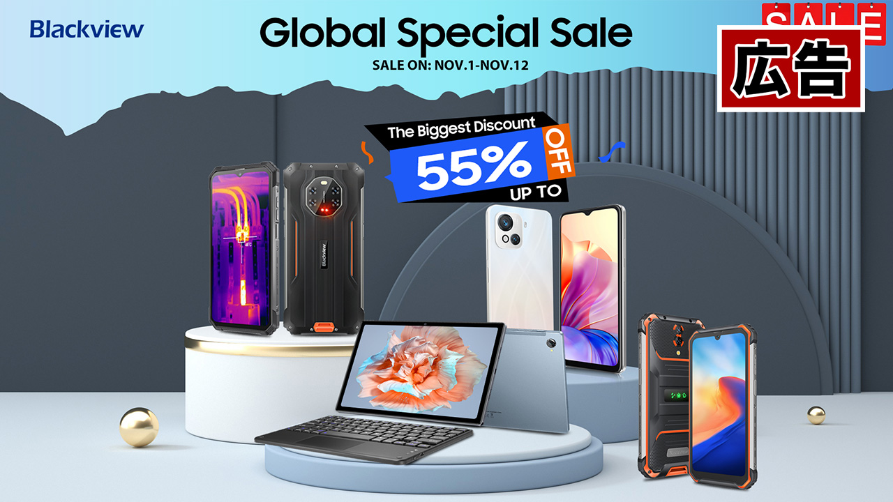 タフネススマホでおなじみのBlackviewにて1111セールが開催!今回はタフネススマホからAndroidタブレット、ミドルレンジスマホがお安くなっており最大55%オフ!