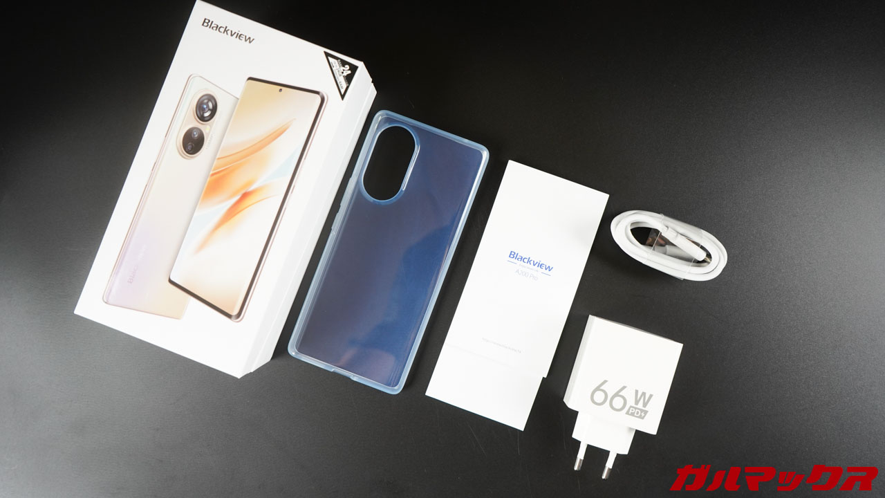 ▼ついでに付属品も紹介しておきます。充電器は66Wが付属していますが、海外プラグなので変換アタッチメントが必要です。ケースは付属していますが保護フィルムはありません。↓