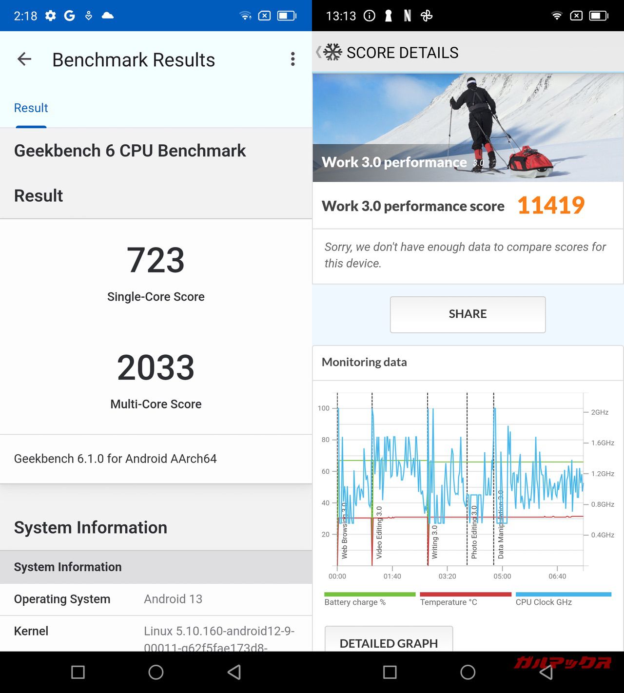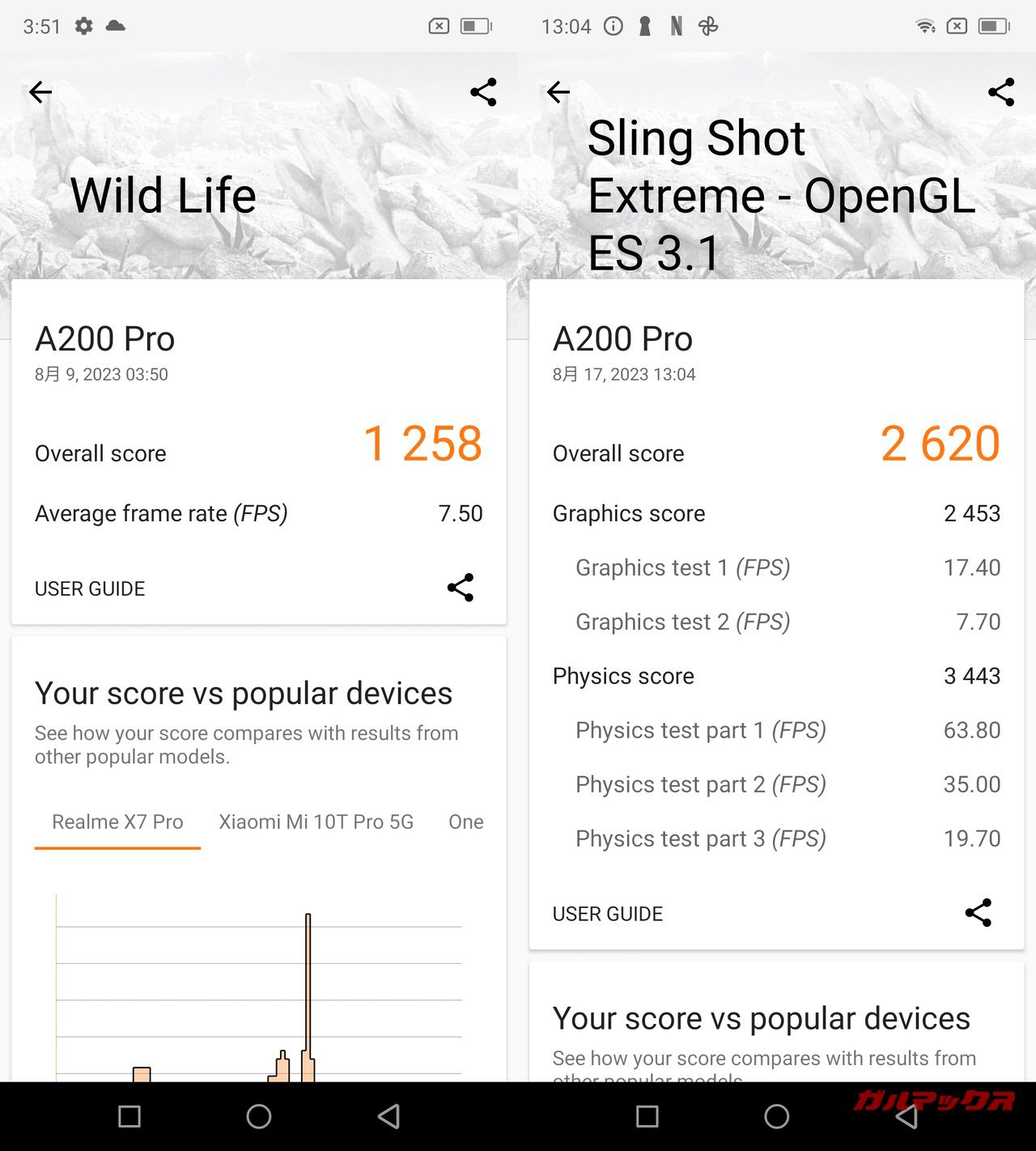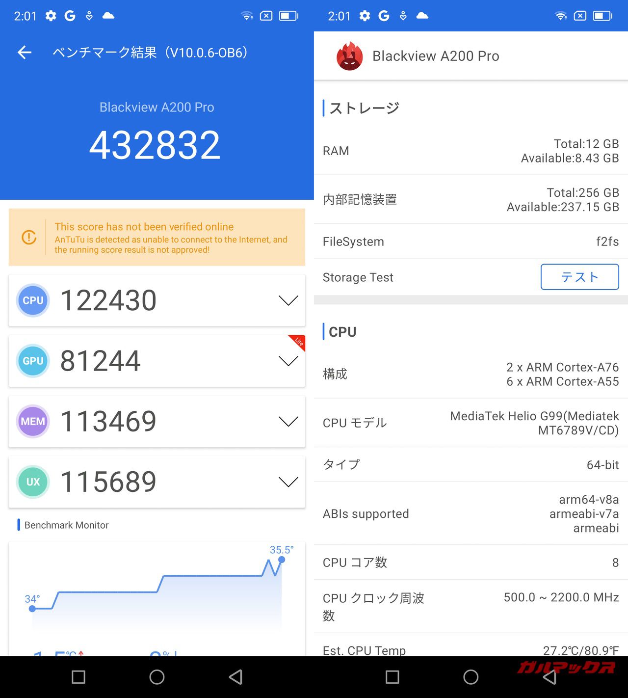 総合的な性能は高いですが、ゲーム性能は低いです。例えば、原神などの重量級ゲームが快適に動作するフラッグシップモデルのゲーム性能はAnTuTuだと60万点台というスコアになるんですが、ミドル機のBlackview A200 Proは8万点台。数値的にもゲーム性能が極端に低いことが分かるはずです。