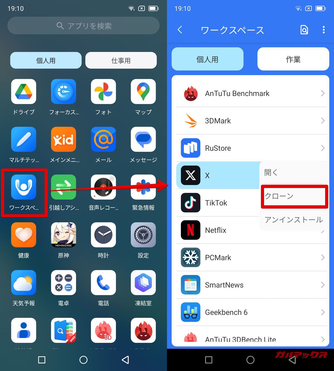 ▼アプリクローン機能は本体設定に組み込まれておらず、ワークスペースアプリで行うようです。「個人用」と「作業用」に分かれていて、例えばX(旧Twitter)ではそれぞれで別のアカウントを設定可能でした。↓