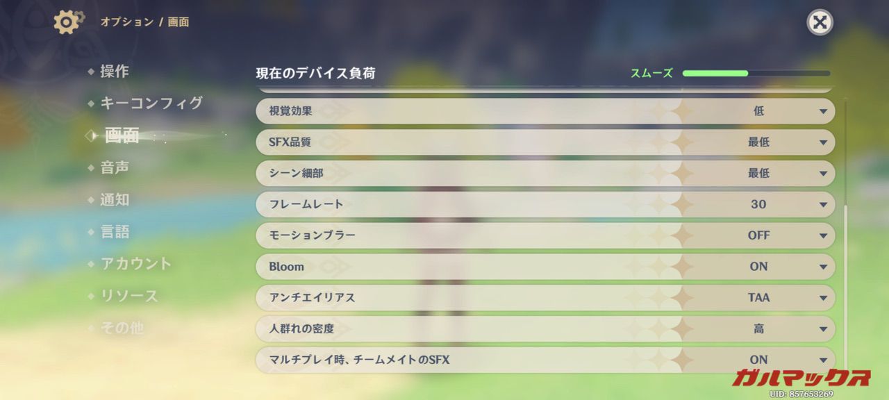 ▼続いてはハイエンドスマホでも「画質」と「滑らかさ」の両立が難しい原神も試してみます。Blackview A200 Proはデフォルト設定が「最低」でした。↓