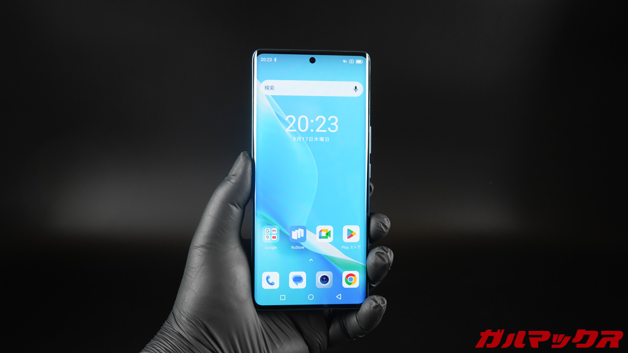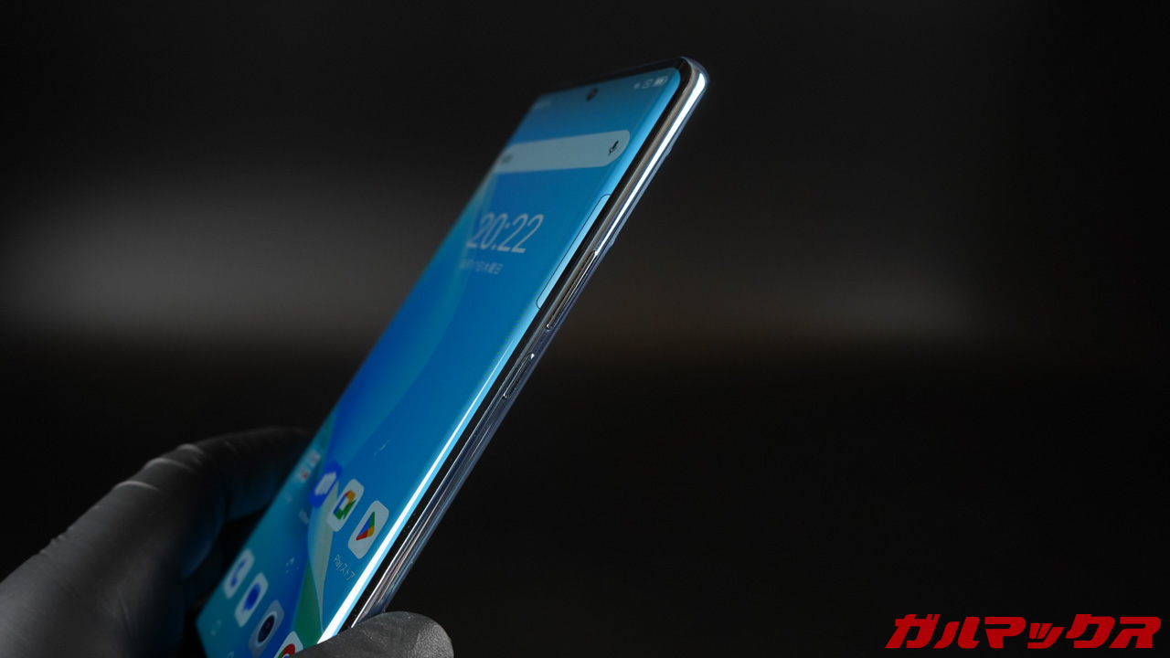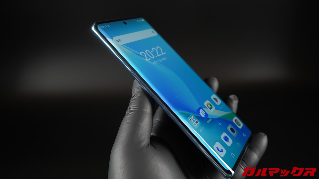 ▼ディスプレイサイズは6.67型で中央上部にパンチホールのあるタイプ。ベゼルはそこそこありますが湾曲したディスプレイのおかげで薄く見えます。丸みを帯びた形状なので持ち心地もGood。片手操作は厳しいです。↓