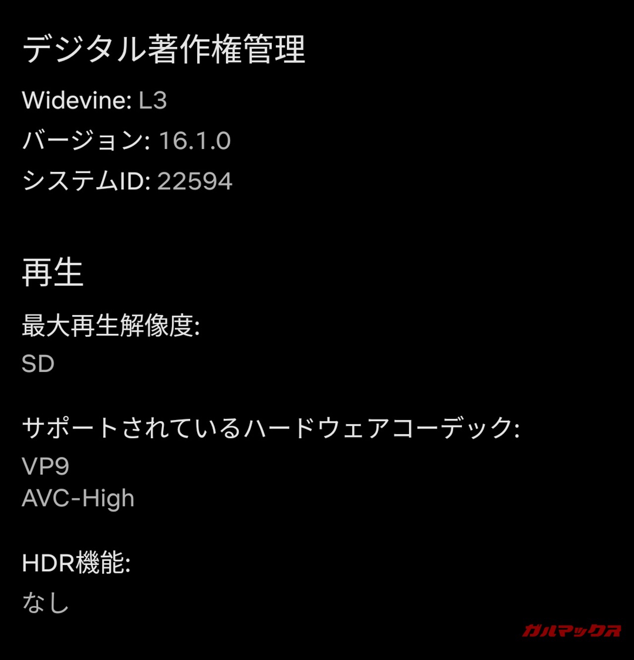 ▼著作権コンテンツを高画質で再生できるか否かを判断できるWidevineのレベルを確認したところ「Widevine L3」でした。↓
