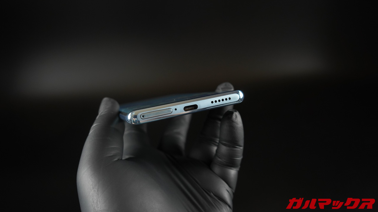 光の当たり方でキラリと輝くカメラ周りのダイヤモンドカットと緩やかに表情を変える淡いブルーの色合いは非常に美しいです。見た目はフラッグシップ級。背面は指紋が付着しづらい加工が施されているそうなので、どれどれとベタベタ触ってましたが、ほんとに指紋が付きません。素晴らしい。
