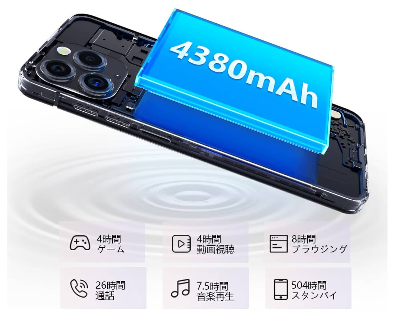 ▼バッテリー容量は4,380mAhと平均よりやや小さめな印象。電池持ちの公称値も動画視聴で4時間と短いです。実使用ではこれより持ってくれることを祈りたい。とはいえ書いてくれるだけまだいい方なのだろうか‥↓
