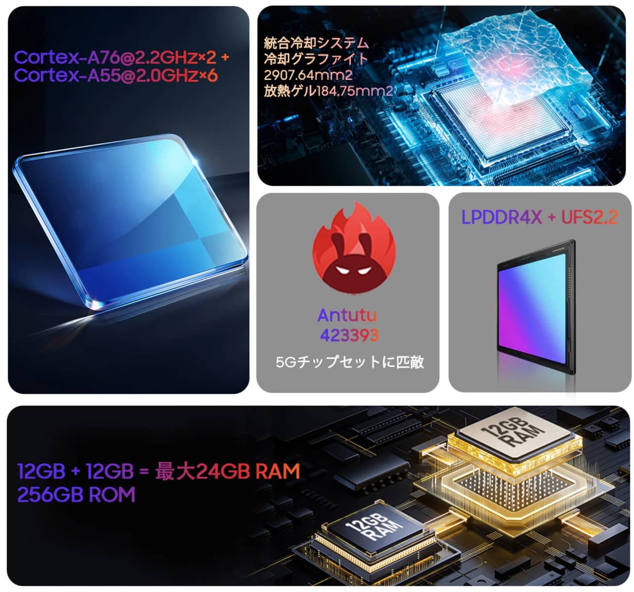 ▼SoCは6nmのHelio G99を採用しておりAnTuTu公称値は42万点クラスとかなりの高さ!3Dの重たいゲームは厳しいですが、普段使いならサクサク快適に動かせるレベルのナイスなスペック。↓