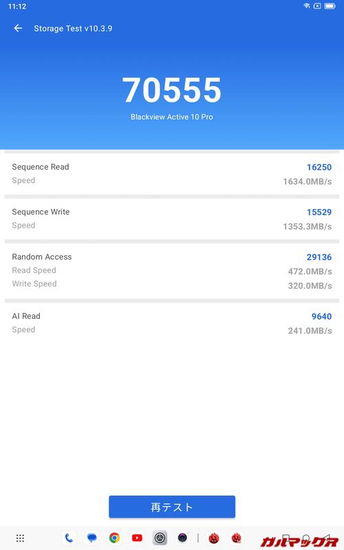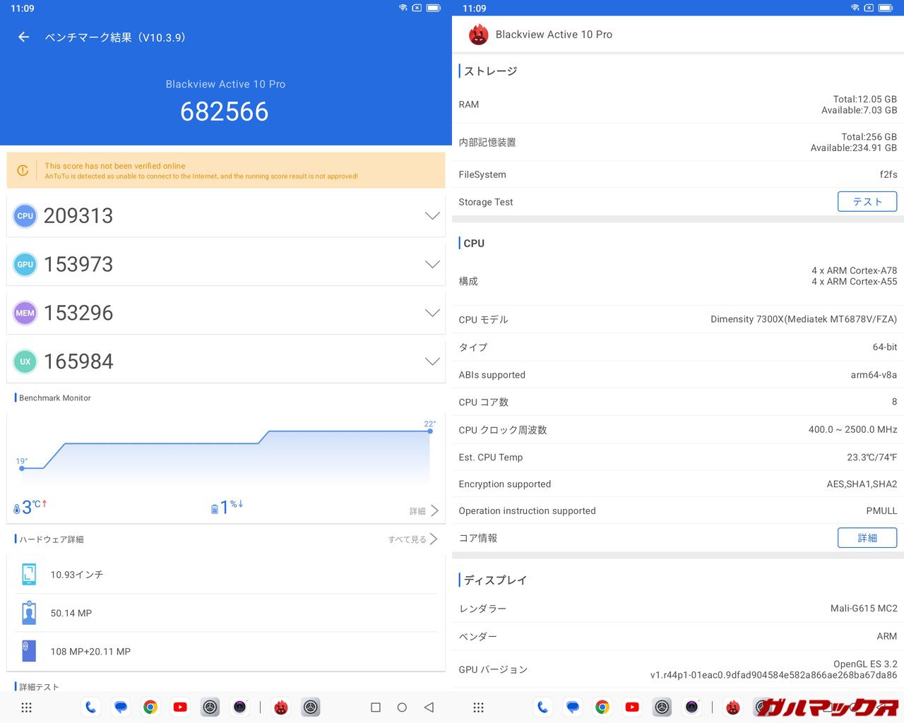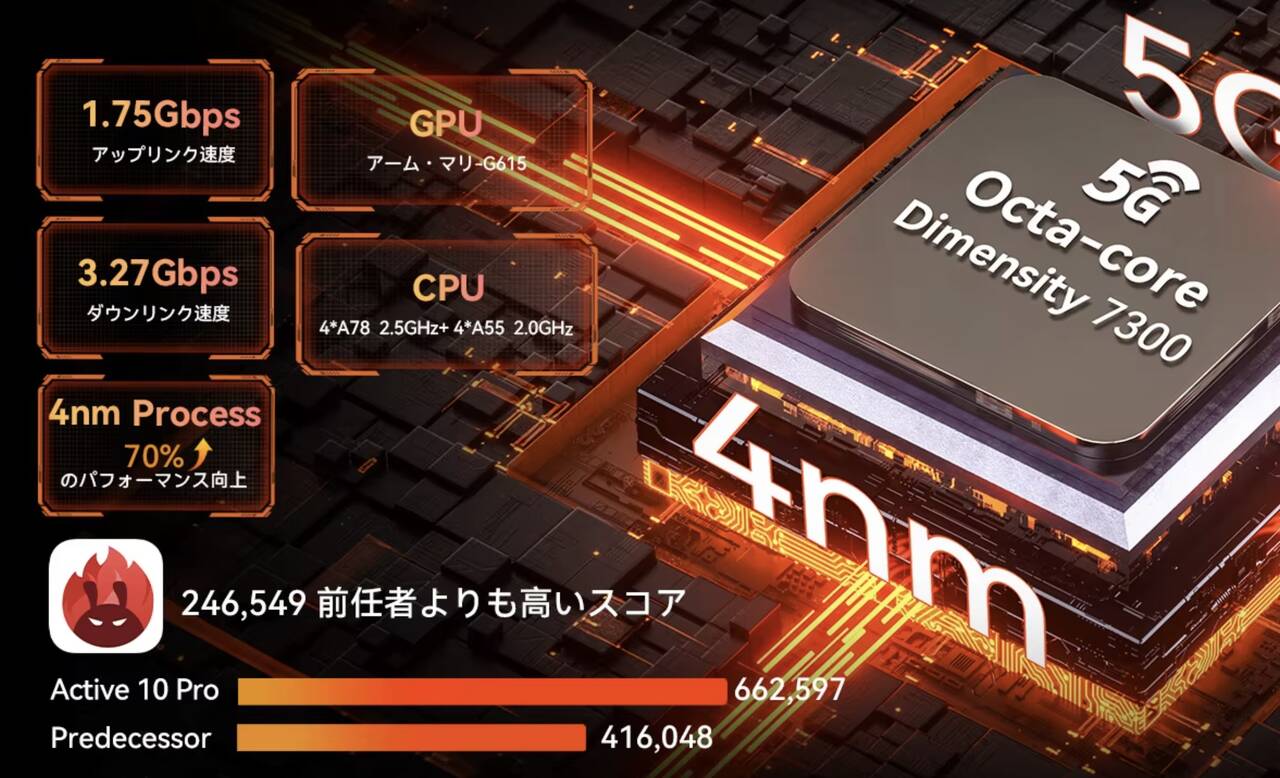 Blackview Active 10 ProはSoCにDimensity 7300を搭載。AnTuTuのメーカー公称値は上記ですが、似たようなスコアがちゃんと実機でも出てました。
