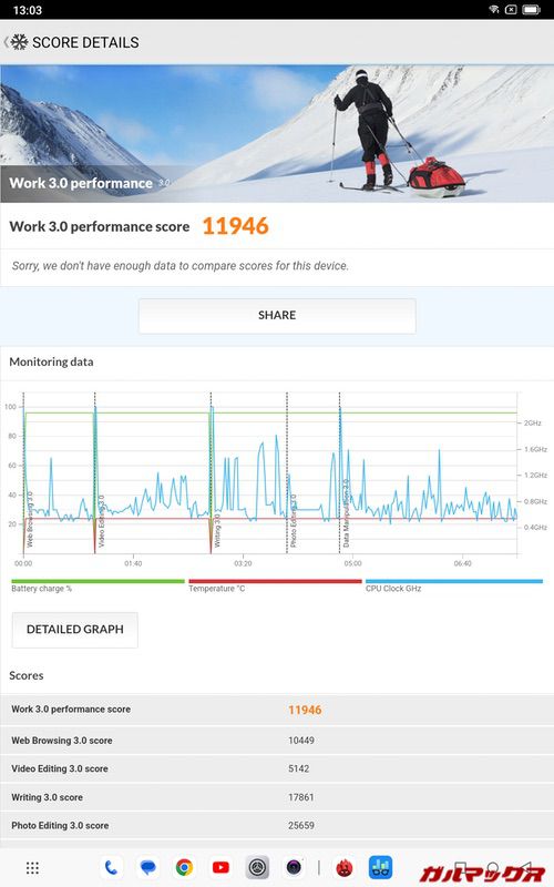バッテリー容量は驚愕の3万mAh。スマホだと5,000mAhくらいが一般的なので6倍、11型だと1万mAhくらいが多いので3倍ほどのバッテリーを積んでます。ヤバすぎ。